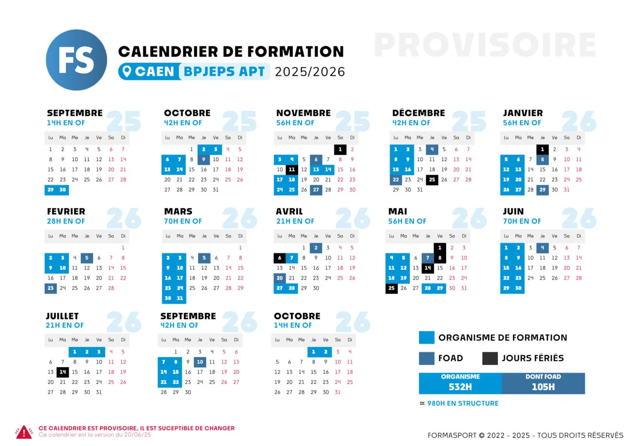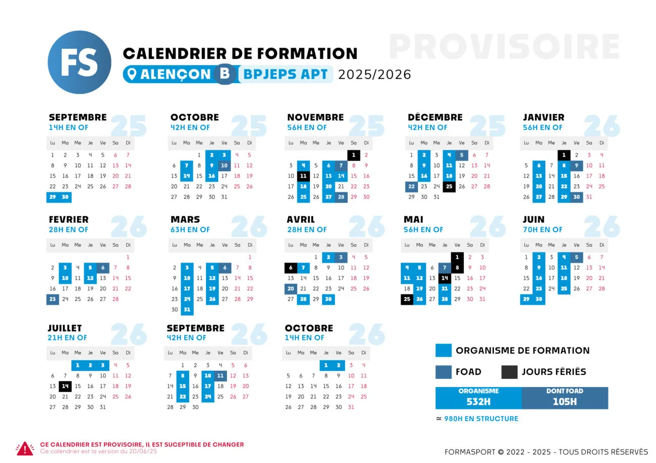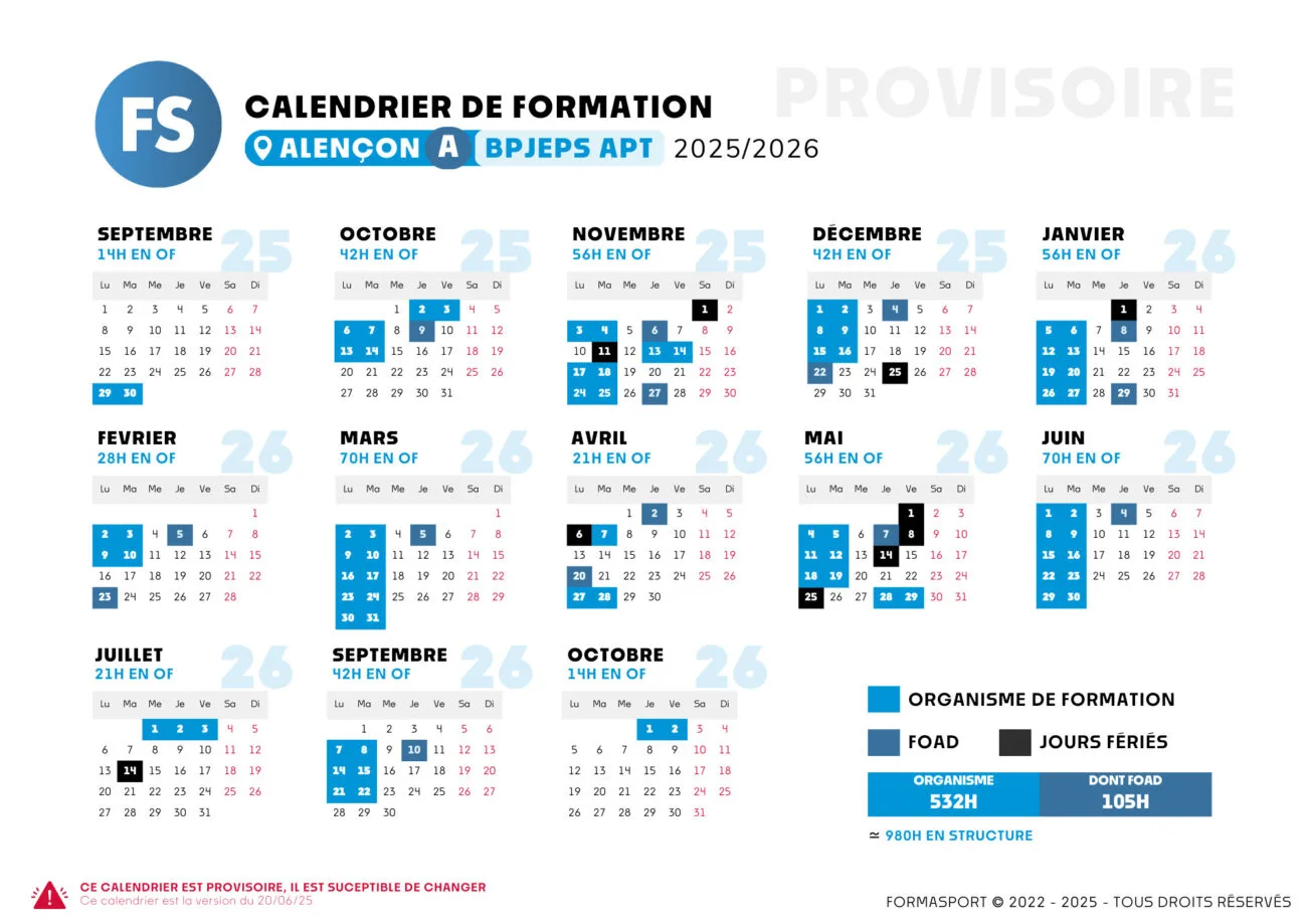 Nous avons ouvert deux sessions pour Alençon avec un calendrier qui s'adapte aux structures. La formation se déroule les lundi / mardi ou bien le mardi / jeudi.